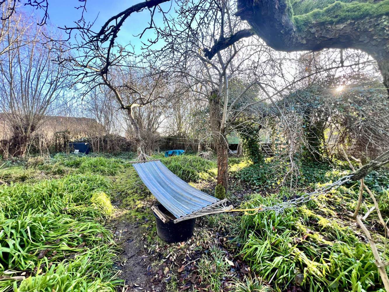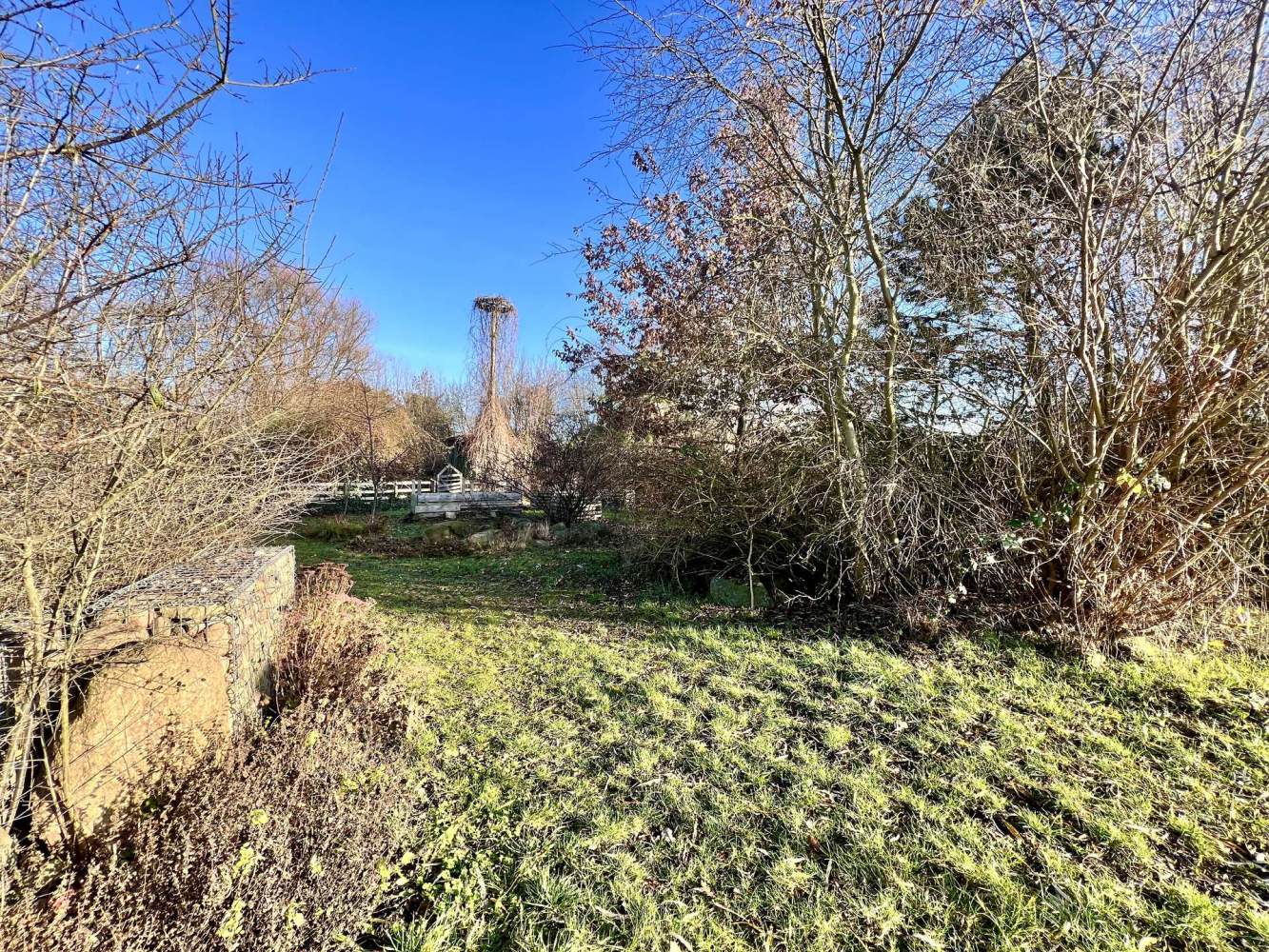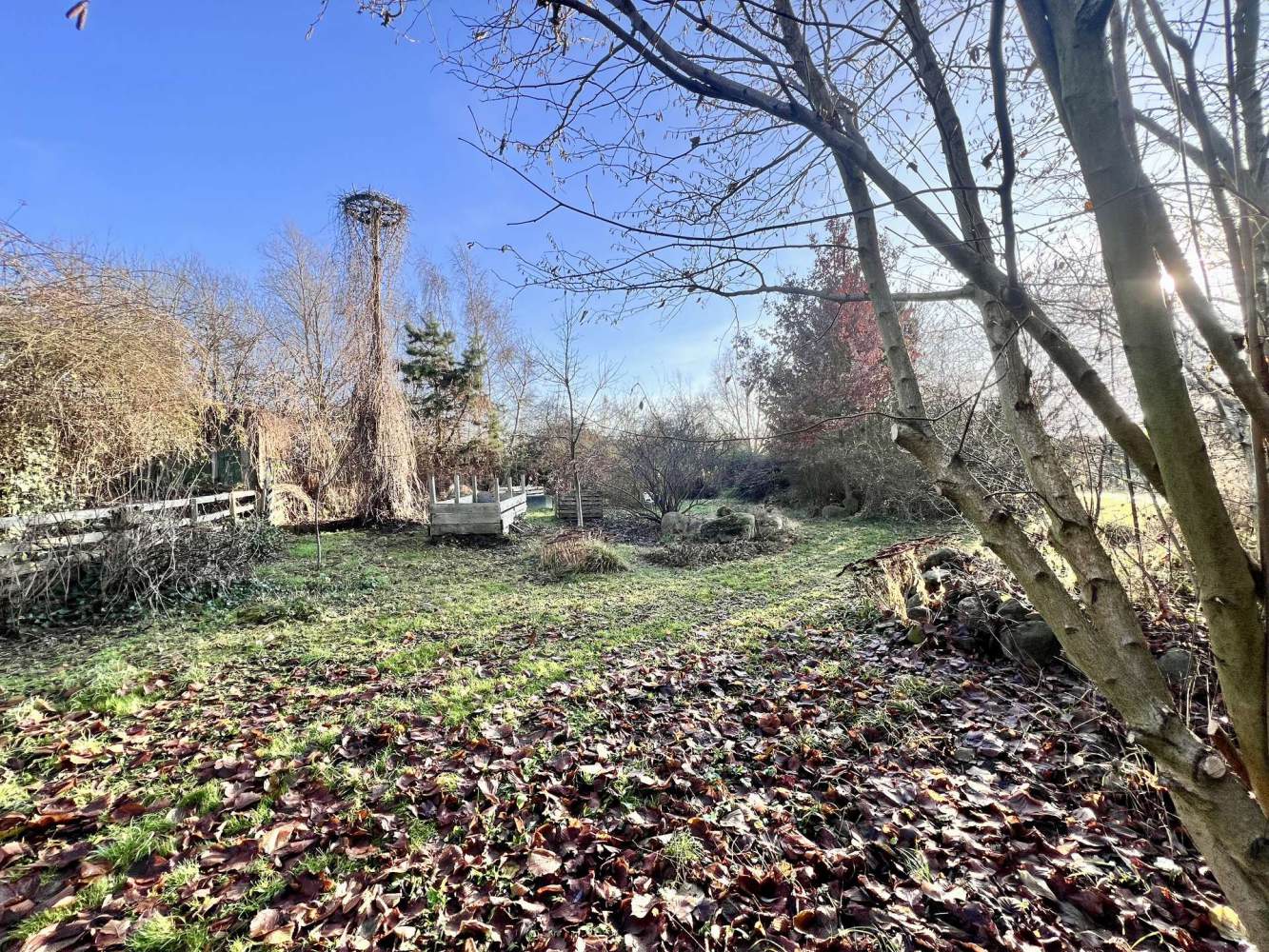 Der etwas kleinere Teil des Grundstücks mit ca. 1.200 m² ergänzt das Ensemble ideal. Hier befindet sich ein von wildem Wein überwucherter Stamm mit einem Storchennest, drei kleine Eichen, zwei Nussbäume sowie zentral ein malerischer Quittenbaum und ein junger Pfirsichbaum. Aktuell sind drei Hochbeete angelegt.