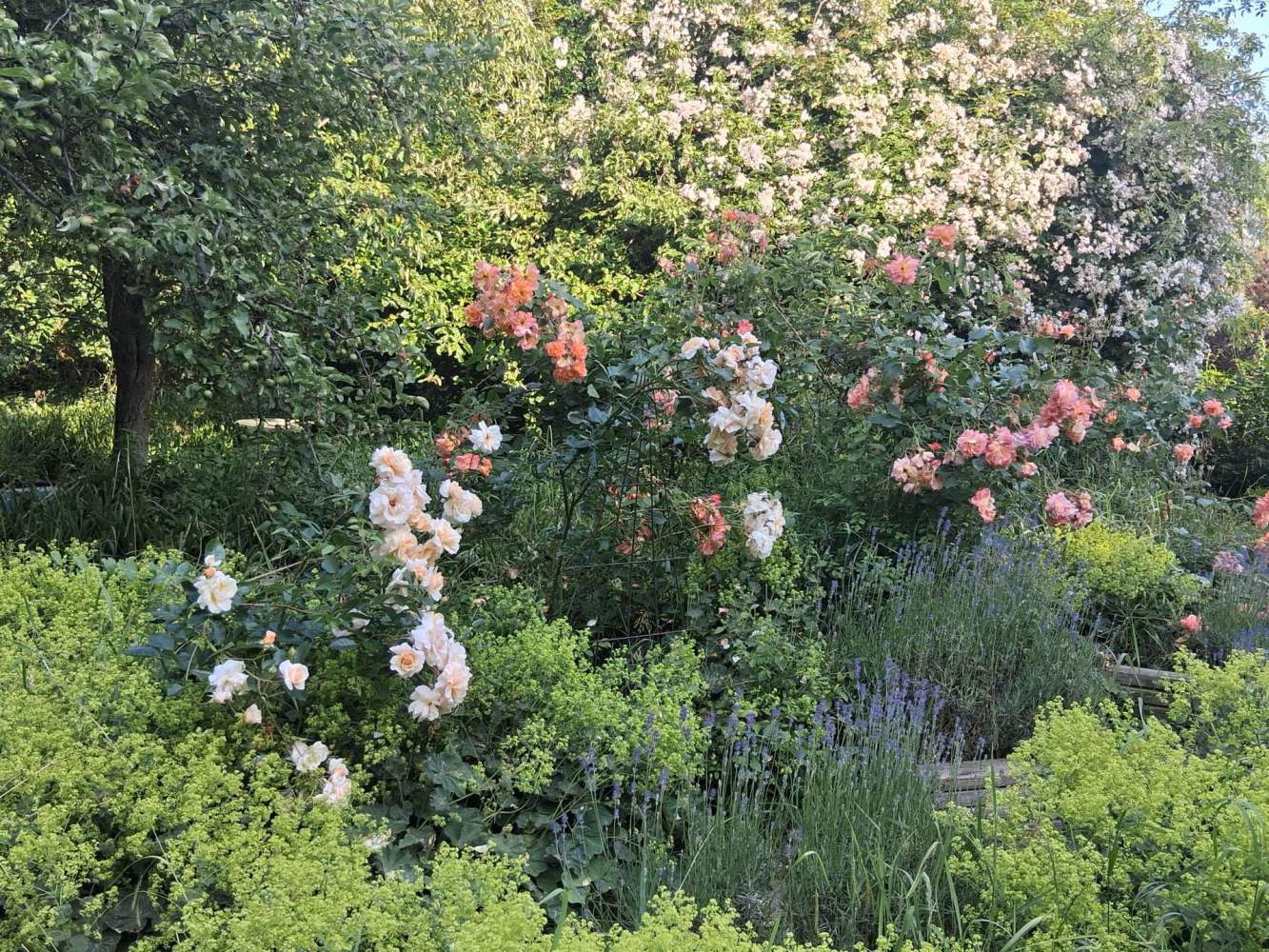 Ein weiterer Bereich des Grundstücks ist von Obstbäumen geprägt: drei Apfelbäume, ein Birnbaum sowie zahlreiche Pflaumenbäume. Besonders hervorzuheben ist ein Apfelbaum, der von einer meterhohen, weißen Kletterrose überwuchert ist – ein außergewöhnlicher Blickfang mit romantischem Charakter.