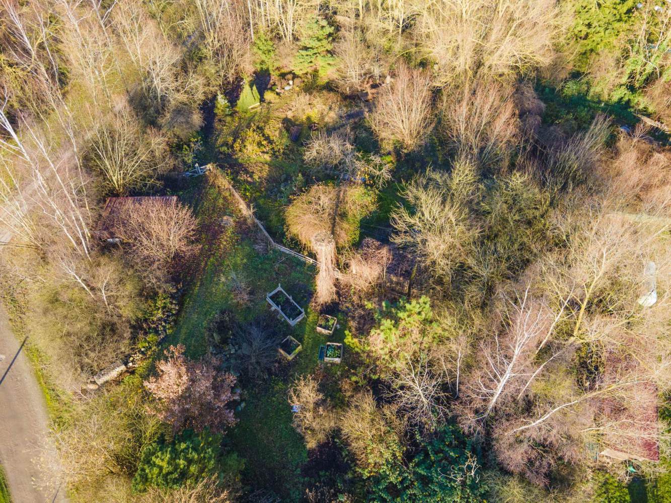 Das Gelände ist bewusst pflegeleicht und ohne klassische Rasenflächen angelegt. Schmale, geschwungene Wege führen durch die parkähnliche Landschaft und verbinden sonnige Bereiche mit angenehm schattigen Rückzugsorten. Eine große Weide sowie mehrere kleinere Weiden spenden natürlichen Schatten und verleihen dem Grundstück eine ruhige, gewachsene Ausstrahlung.