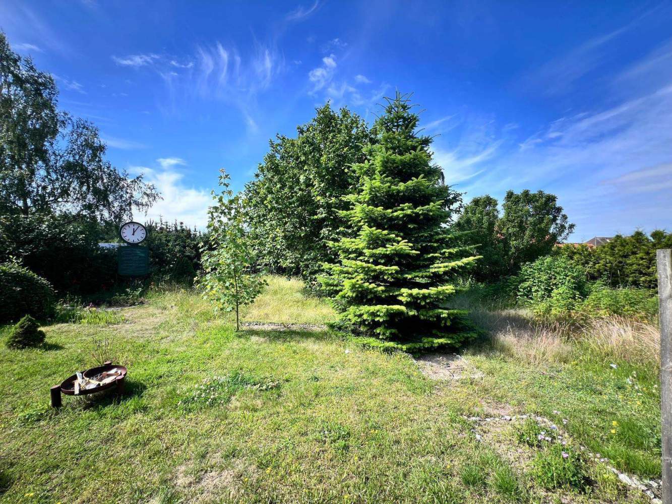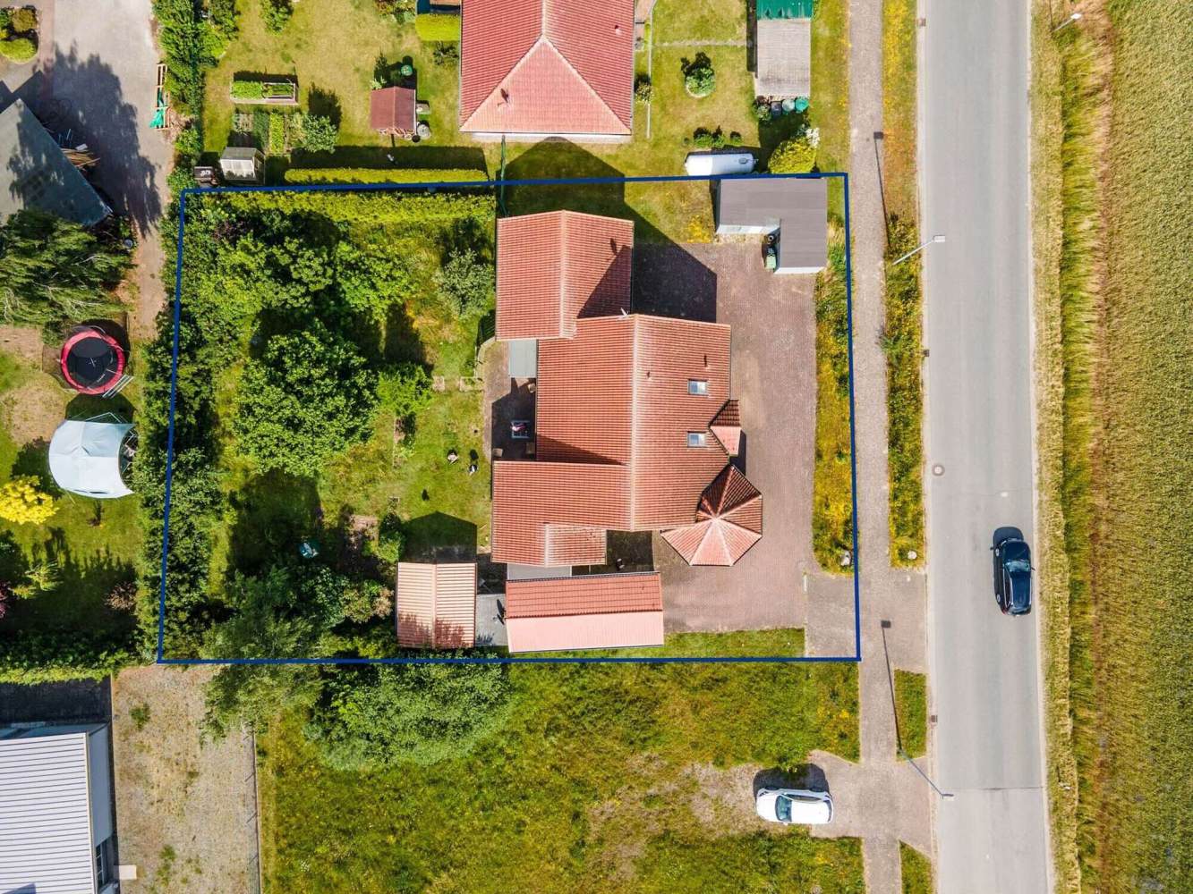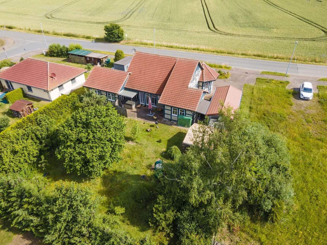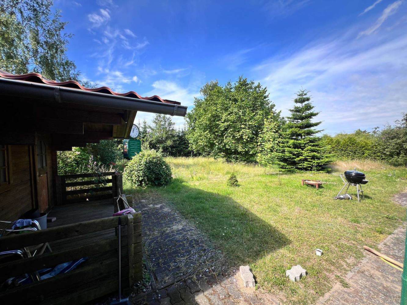 Die südwestlich ausgerichteten Terrasse öffnet den Blick über das insgesamt 1120 m² große Grundstück, das im Gartenbereich von Sträuchern und Bäumen umgeben und so nicht von den Nachbargrundstücken einsehbar ist. Der Grundstücksbereich vor dem Objekt ist gepflastert und bietet Parkmöglichkeiten. Zusätzlich befindet sich an der Westseite ein Carport und an der Nordseite ein kleines Gebäude für Gartengeräte und Fahrräder.