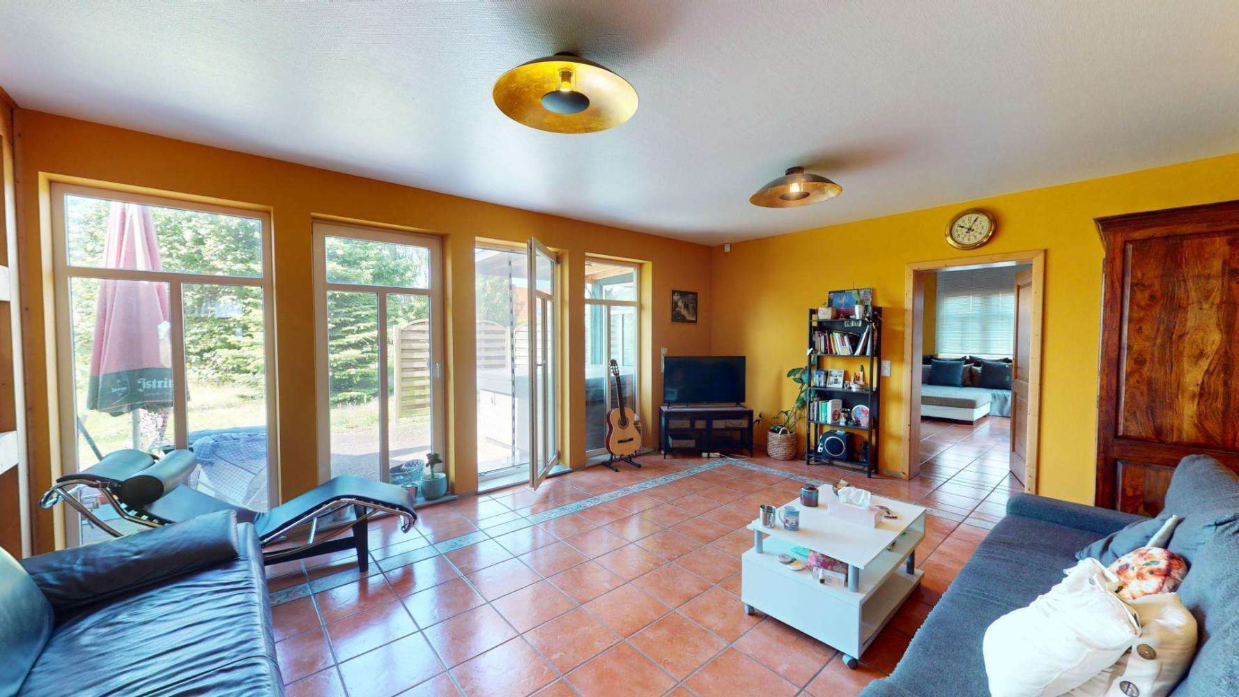 Das Erdgeschoss besticht durch seine großen und offenen Räume. An die großzügige Küche schließt sich praktischer Weise direkt ein Esszimmer an. Das Badezimmer verfügt über eine Badewanne und eine Dusche. Des Weiteren befinden sich hier ein Büro, ein Schlafzimmer und zwei große Wohnräume.