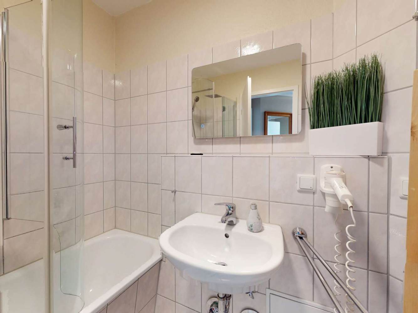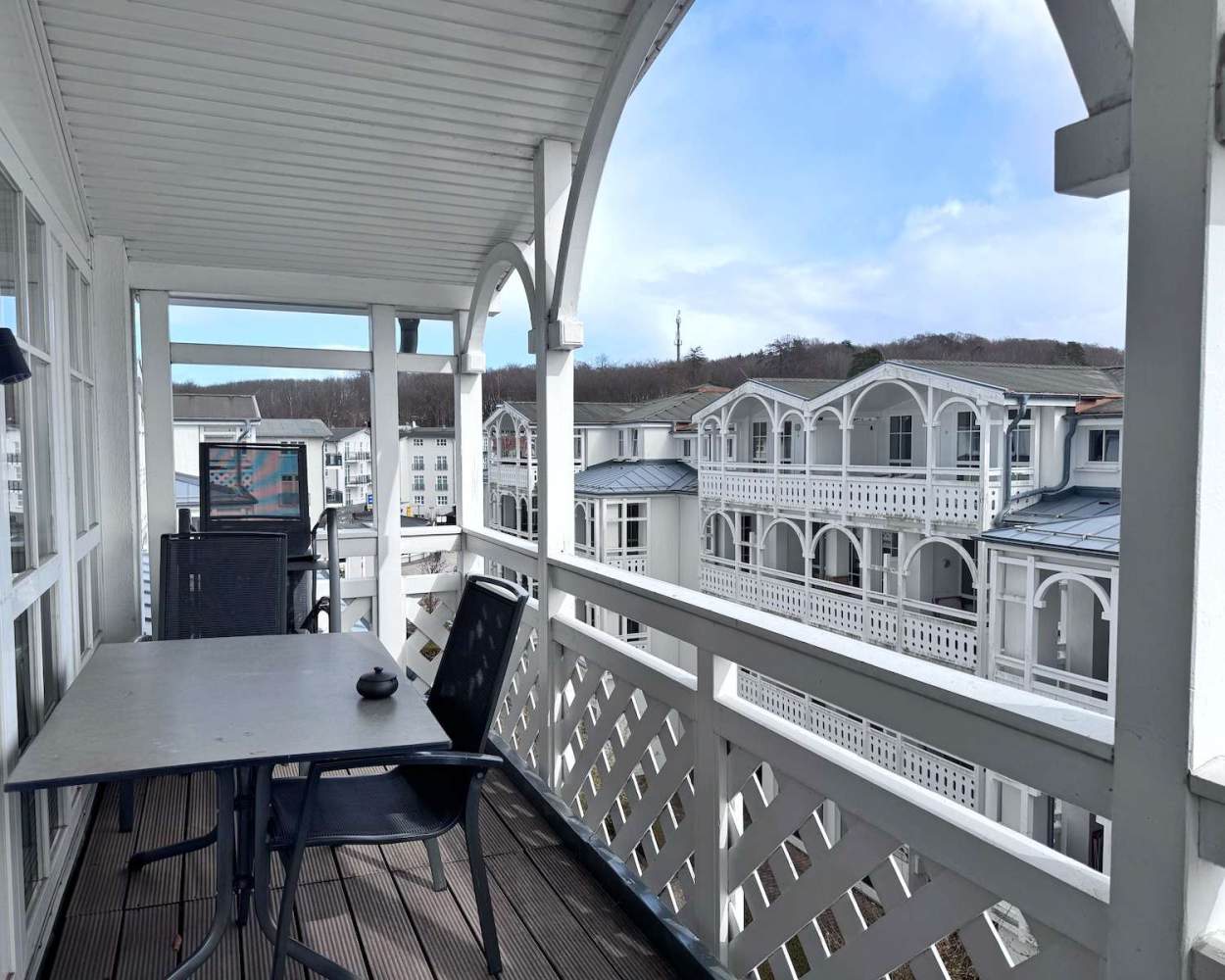 Das Raumangebot wird durch ein Badezimmer mit Badewanne sowie ein separates WC ergänzt – ein klarer Vorteil bei höherer Belegung. Der große Balkon mit Tisch und Stühlen lädt zum Verweilen ein und bietet zusätzlichen Wohnkomfort im Außenbereich.