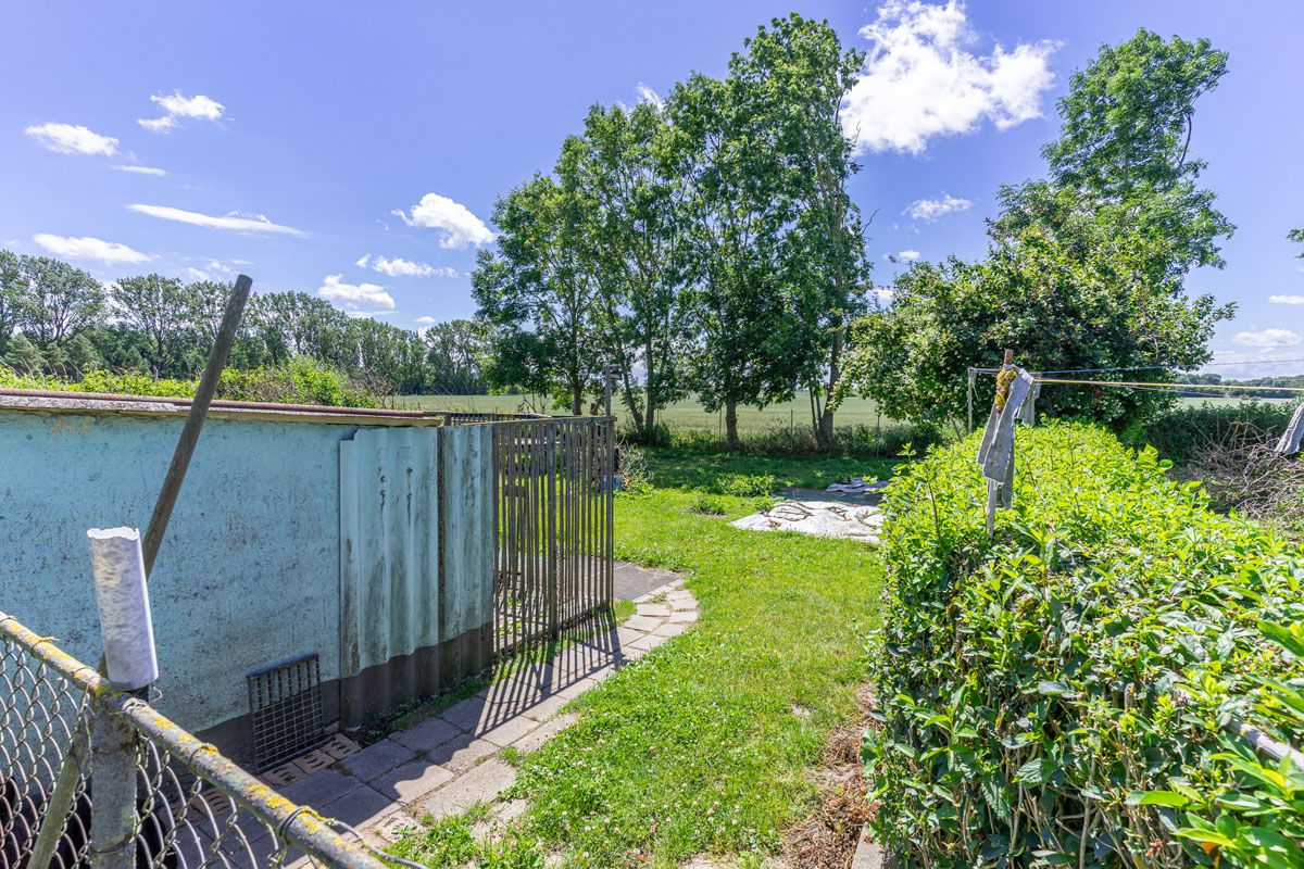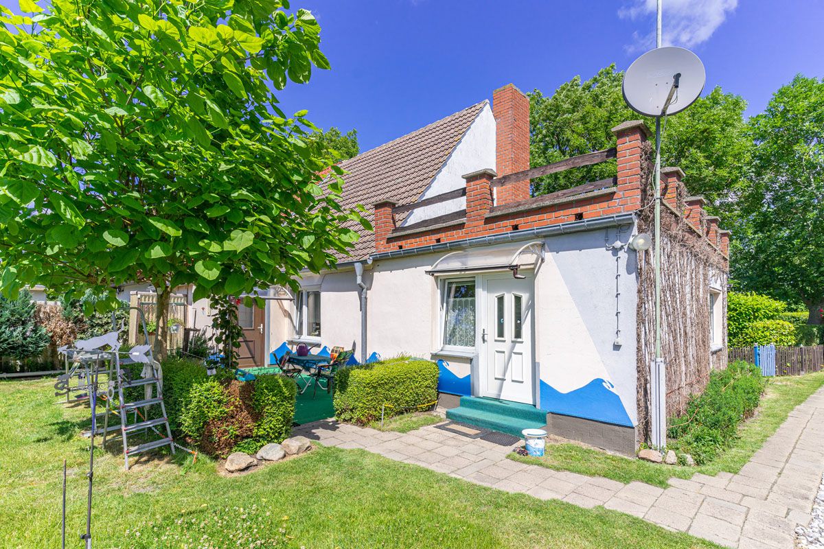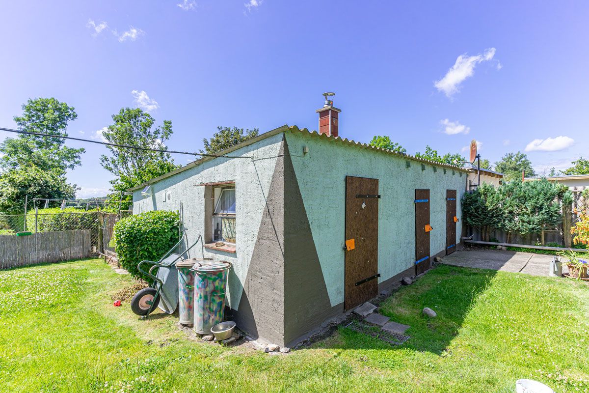 Sehr ruhig am Feldrand gelegen, befindet sich diese Doppelhaushälfte aus dem Jahr 1954 in einer kleinen Gemeinde auf der Halbinsel Wittow abseits des hektischen Treibens der Seebäder. Es verfügt über ein gepflegtes, etwa 1632 qm großes Grundstück, auf dem es neben einem Garten mit Gewächshaus, einer Garage, einem Nebengebäude mit Heizungsraum und Hühnerstall auch eine alte Hundezwingeranlage gibt. Die Doppelhaushälfte selbst, ist einfach ausgestattet und gliedert sich in die Hauptwohnung und einen Anbau. Die Hauptwohnung betreten Sie über die Veranda und gelangen in den Flur. Hier führt Sie eine stabile Holztreppe in die obere Etage, welche über ein geräumiges Schlafzimmer sowie ein kleines Bad mit Toilette und Waschbecken verfügt. Über das Schlafzimmer gelangen Sie auf das Dach des Anbaus, das mit wenig Materialeinsatz zu gemütlichen Sonnenterrasse mit Südost-Ausrichtung erweitert werden kann. Das Erdgeschoss der Hauptwohnung gliedert sich in eine separate Küche, ein kleines Büro, ein großes Wohnzimmer sowie ein Badezimmer.