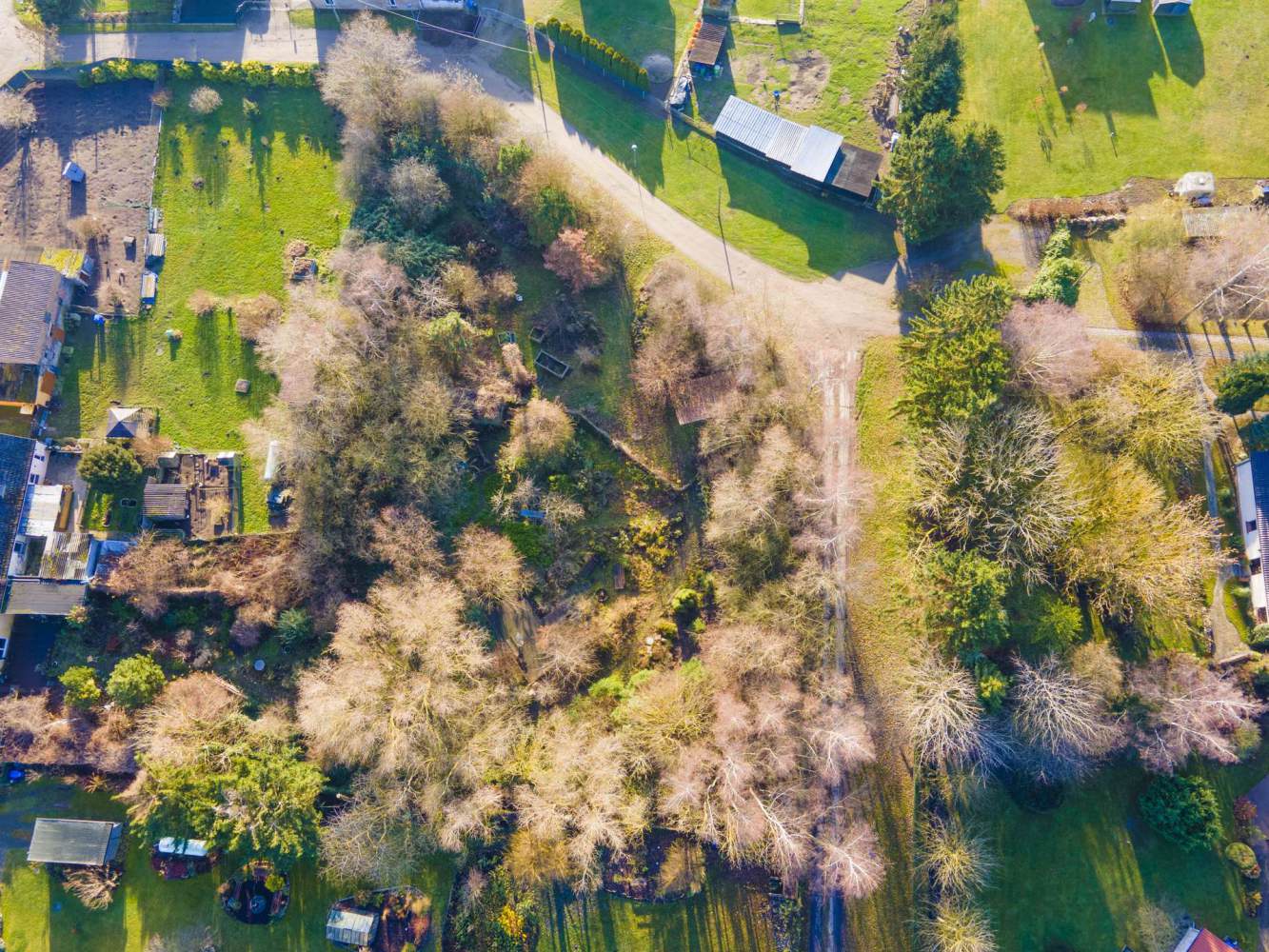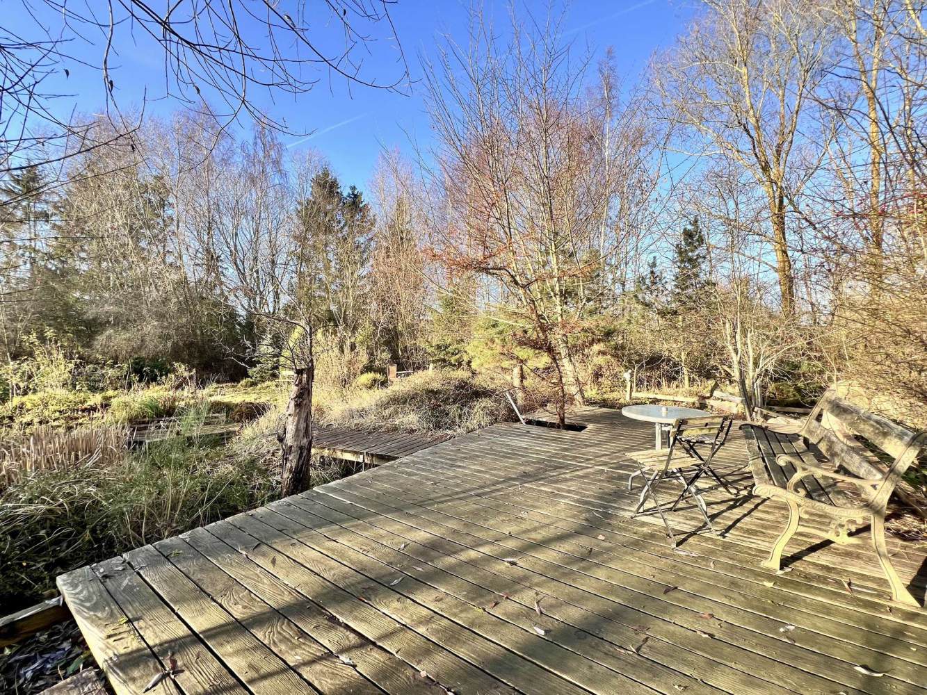 Dieses außergewöhnlich gestaltete, zweigeteilte Grundstück mit einer Gesamtfläche von 3.799 m² bietet ein hohes Maß an Privatsphäre, Naturverbundenheit und gestalterischer Qualität. Das Grundstück ist vollständig von einem hohen Erdwall umgeben, der mit Birken, Weiden und Schlehenbüschen bepflanzt wurde. Dadurch ist das Areal absolut dicht, nicht einsehbar und windgeschützt – ein geschützter Rückzugsort mit besonderer Atmosphäre.