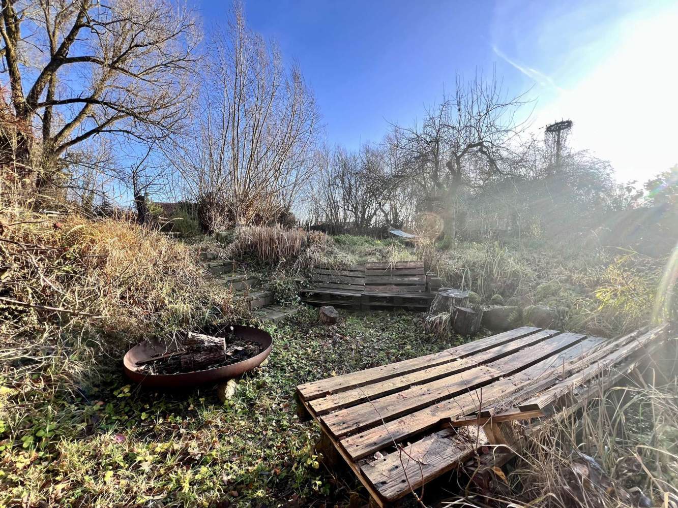 Der etwas kleinere Teil des Grundstücks mit ca. 1.200 m² ergänzt das Ensemble ideal. Hier befindet sich ein von wildem Wein überwucherter Stamm mit einem Storchennest, drei kleine Eichen, zwei Nussbäume sowie zentral ein malerischer Quittenbaum und ein junger Pfirsichbaum. Aktuell sind drei Hochbeete angelegt.