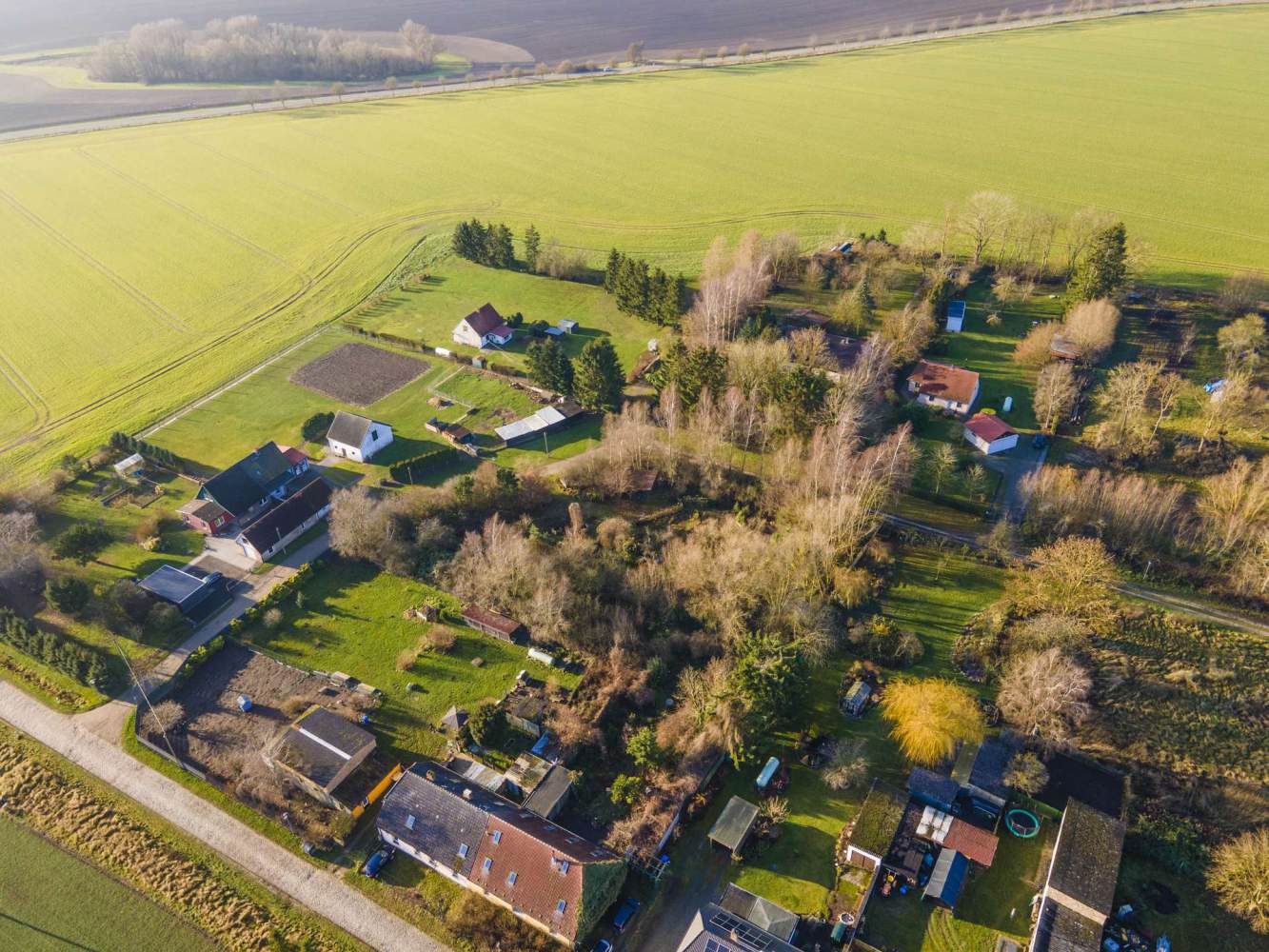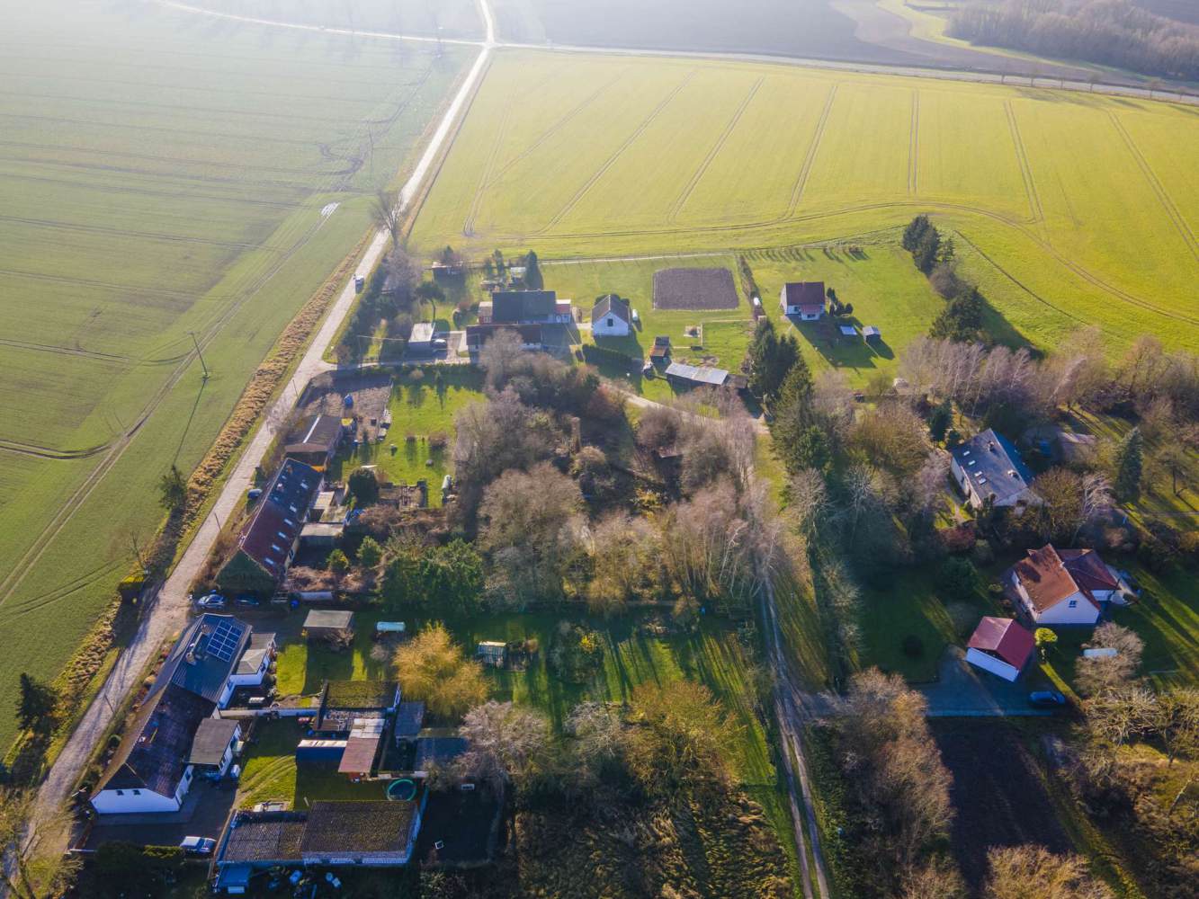 Die Umgebung ist geprägt von weitläufigen Feldern, grünen Wiesen und sanfter, bäuerlicher Struktur – ideal für Menschen, die Ruhe, Natur und Freiraum schätzen. Das Grundstück liegt eingebettet in eine harmonische Nachbarschaft aus vereinzelter Wohnbebauung, Gartenflächen und naturbelassenen Parzellen.