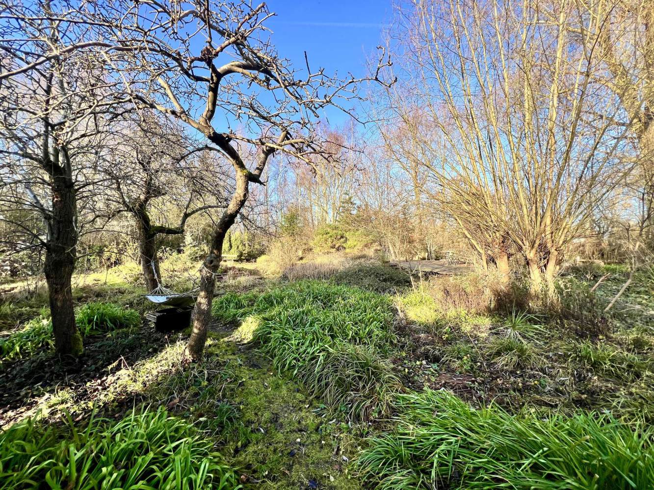 Das Gelände ist bewusst pflegeleicht und ohne klassische Rasenflächen angelegt. Schmale, geschwungene Wege führen durch die parkähnliche Landschaft und verbinden sonnige Bereiche mit angenehm schattigen Rückzugsorten. Eine große Weide sowie mehrere kleinere Weiden spenden natürlichen Schatten und verleihen dem Grundstück eine ruhige, gewachsene Ausstrahlung.