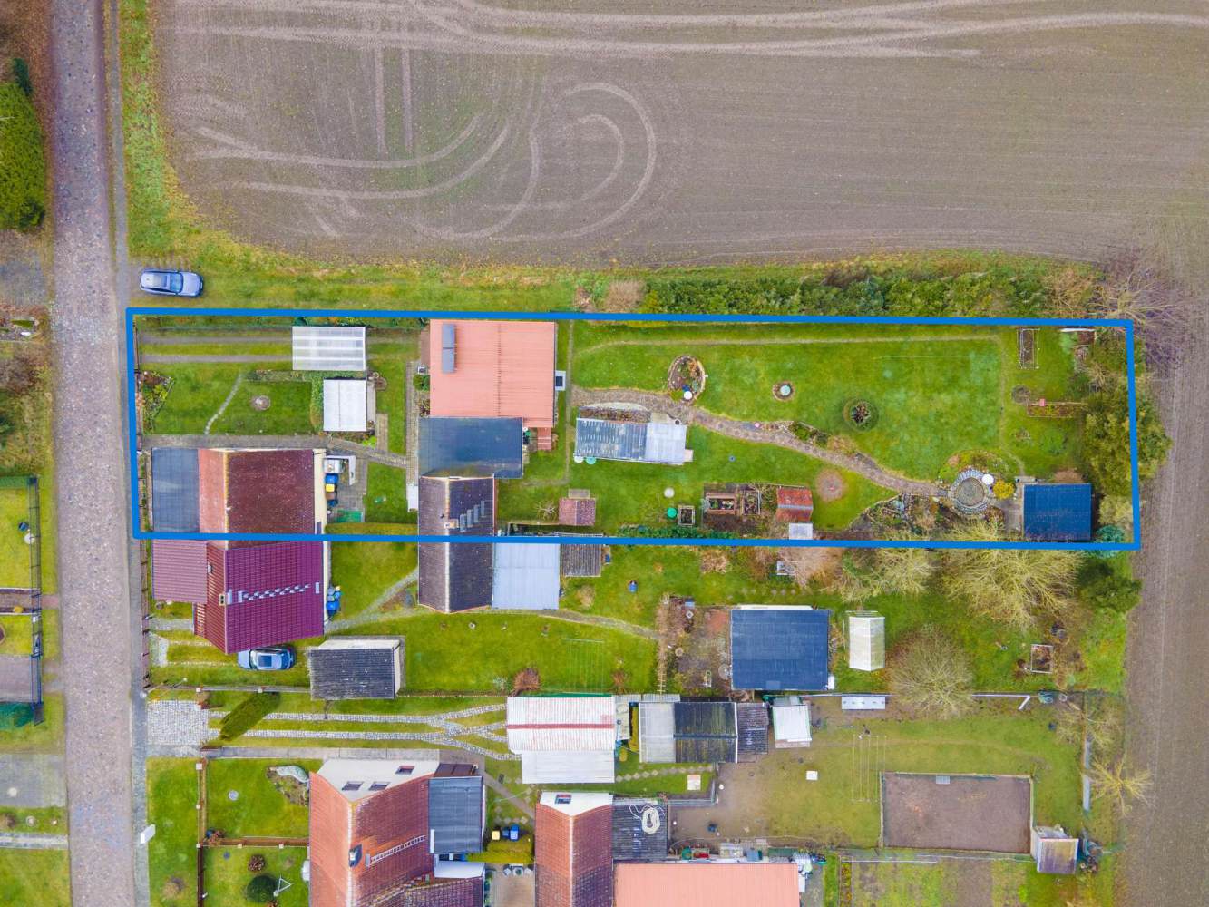 Das Grundstück mit ca. 1.171 m² ist gepflegt angelegt und grenzt direkt an offene Felder, wodurch ein hohes Maß an Ruhe und Privatsphäre gewährleistet ist. Der Garten lädt zum Entspannen ein und bietet ausreichend Platz für Freizeit, Erholung oder gärtnerische Gestaltung. Eine überdachte Terrasse erweitert den Wohnraum ins Freie und ermöglicht eine witterungsunabhängige Nutzung.