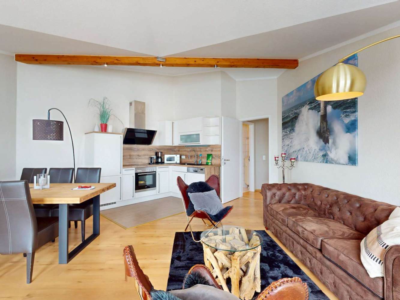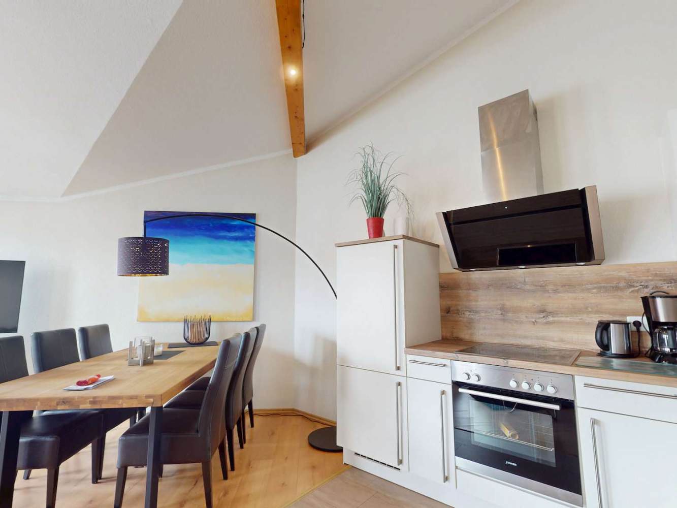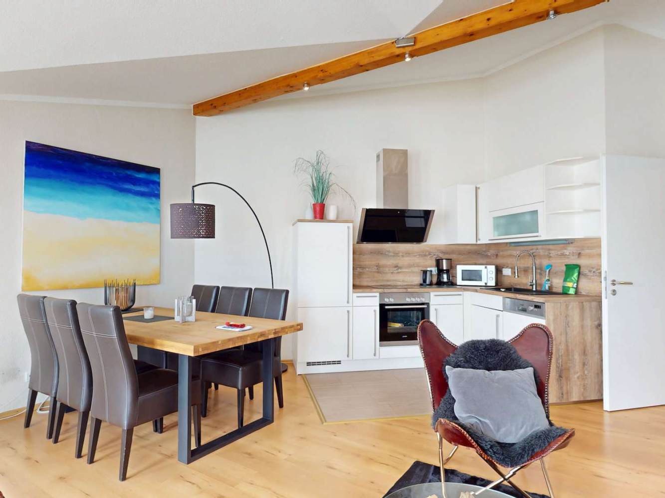 Die Hauptwohnung befindet sich im Obergeschoss und überzeugt mit ca. 70 m² Wohnfläche sowie einem penthouseähnlichen Charakter. Sie ist für bis zu sechs Gäste ausgelegt und wird aktuell erfolgreich in der Ferienvermietung genutzt.